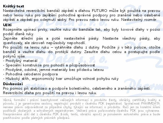 Nastavitelná reverzibilní bandáž zápěstí s dlahou FUTURO může být použitá na pravou nebo levou ruku pro zajištění pohodlné správné podpory pro zraněné nebo oslabené zápěstí a zápěstí po odejmutí sádry. Pro pravou nebo levou ruku. Nastavitelný rozměr.