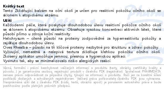 Tento Zklidňující balzám na oční okolí je určen pro reaktivní pokožku očního okolí se sklonem k atopickému ekzému.