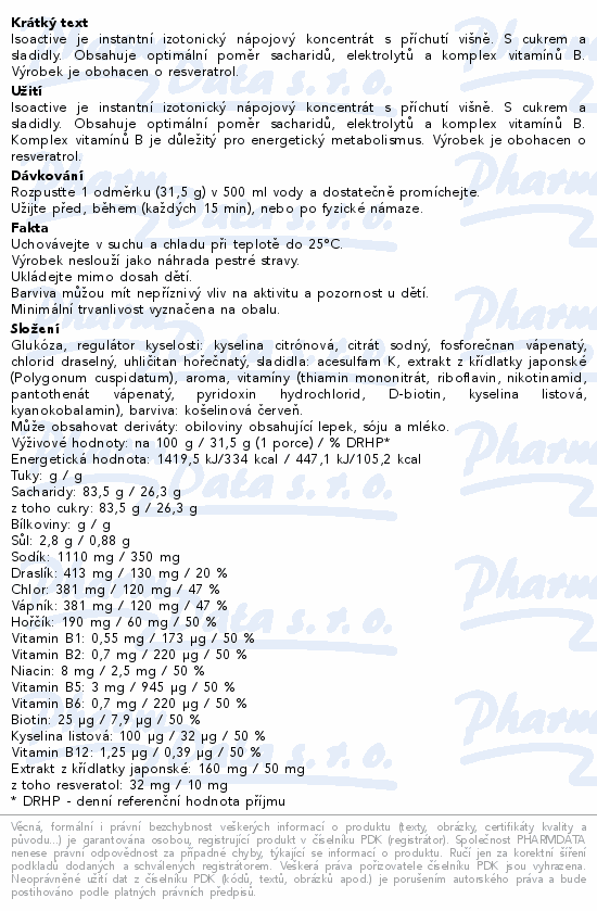 Isoactive je instantní izotonický nápojový koncentrát s příchutí višně. S cukrem a sladidly. Obsahuje optimální poměr sacharidů, elektrolytů a komplex vitamínů B. Výrobek je obohacen o resveratrol.