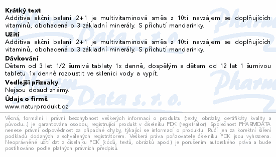 Additiva akční balení 2+1 je multivitaminová směs z 10ti navzájem se doplňujících vitaminů, obohacená o 3 základní minerály. S příchutí mandarinky.