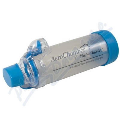 Antistatický inhalační nástavec AeroChamber Plus s ventilem, s indikátorem inspiračního průtoku Flow-Vu, pro inhalační podávání léků (vdechování). Léky se dostávají přímo do dýchacích cest, kde mají velký léčebný účinek a minimální nebo žádné riziko nežád