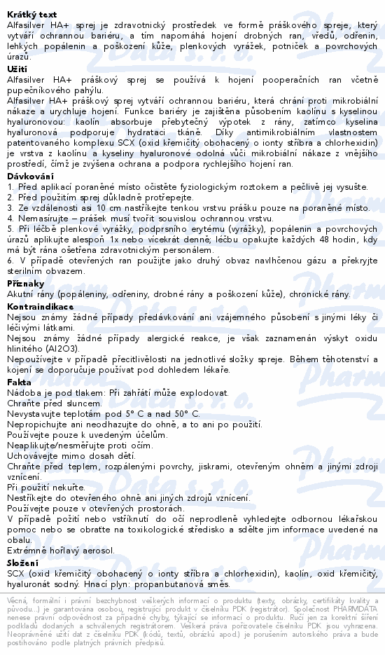 Alfasilver HA+ sprej je zdravotnický prostředek ve formě práškového spreje, který vytváří ochrannou bariéru, a tím napomáhá hojení drobných ran, vředů, odřenin, lehkých popálenin a poškození kůže, plenkových vyrážek, potniček a povrchových úrazů.
