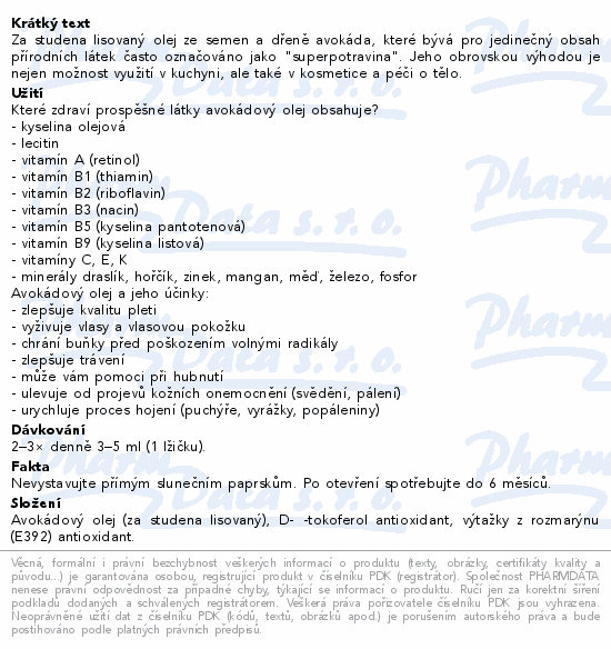 Za studena lisovaný olej ze semen a dřeně avokáda, které bývá pro jedinečný obsah přírodních látek často označováno jako "superpotravina". Jeho obrovskou výhodou je nejen možnost využití v kuchyni, ale také v kosmetice a péči o tělo.