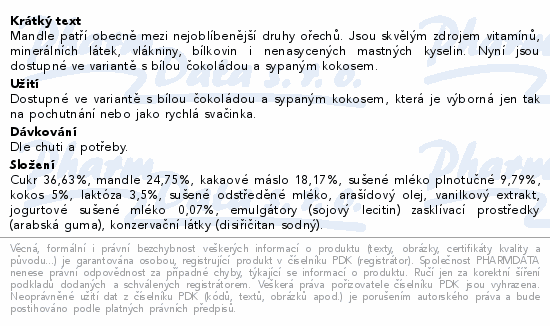 Mandle patří obecně mezi nejoblíbenější druhy ořechů. Jsou skvělým zdrojem vitamínů, minerálních látek, vlákniny, bílkovin i nenasycených mastných kyselin. Nyní jsou dostupné ve variantě s bílou čokoládou a sypaným kokosem.