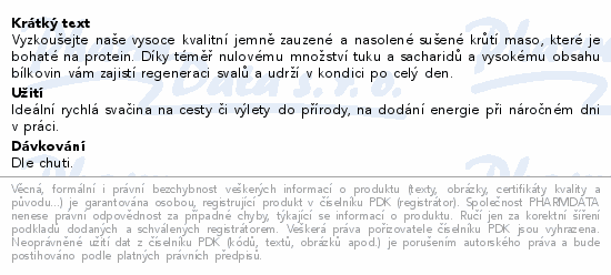 Vyzkoušejte naše vysoce kvalitní jemně zauzené a nasolené sušené krůtí maso, které je bohaté na protein. Díky téměř nulovému množství tuku a sacharidů a vysokému obsahu bílkovin vám zajistí regeneraci svalů a udrží v kondici po celý den.