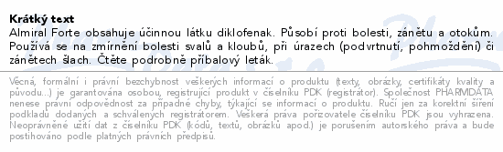 Almiral Forte obsahuje účinnou látku diklofenak. Působí proti bolesti, zánětu a otokům. Používá se na zmírnění bolesti svalů a kloubů, při úrazech (podvrtnutí, pohmoždění) či zánětech šlach. Čtěte pozorně příbalový leták.