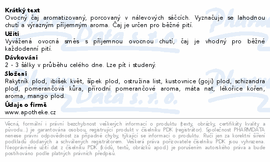 Ovocný čaj aromatizovaný, porcovaný v nálevových sáčcích. Vyznačuje se lahodnou chutí a výrazným příjemným aroma. Čaj je určen pro běžné pití.