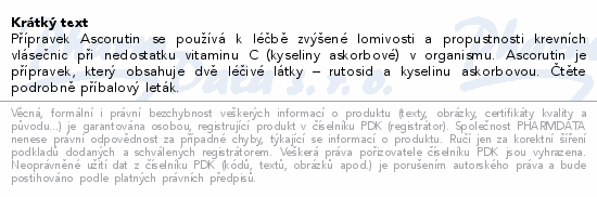 Přípravek Ascorutin se používá k léčbě zvýšené lomivosti a propustnosti krevních vlásečnic při nedostatku vitaminu C (kyseliny askorbové) v organismu. Ascorutin je přípravek, který obsahuje dvě léčivé látky – rutosid a kyselinu askorbovou. Čtěte pozorně příbalový leták.