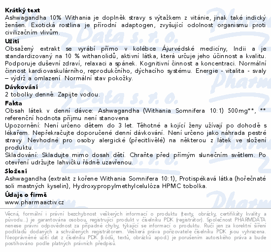 Ashwagandha 10% Withania je doplněk stravy s výtažkem z vitánie, jinak také indický ženšen. Exotická rostlina je přírodní adaptogen, zvyšující odolnost organismu proti civilizačním vlivům.