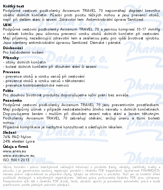 Podpůrné cestovní podkolenky Avicenum TRAVEL 70 napomáhají zlepšení krevního oběhu dolních končetin. Působí proti pocitu těžkých nohou a jsou prevencí otoků, např. při delším stání či sezení. Zdravotní lem. Antimikrobiální úprava Sanitized.