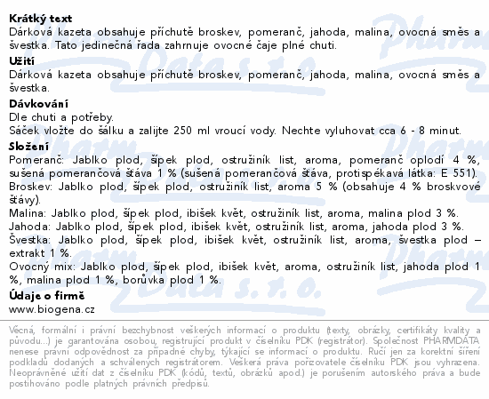 Dárková kazeta obsahuje příchutě broskev, pomeranč, jahoda, malina, ovocná směs a švestka. Tato jedinečná řada zahrnuje ovocné čaje plné chuti.