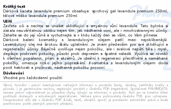 Dárková kazeta levandule premium obsahuje: sprchový gel levandule premium 250ml, tělové mléko levandule premium 250ml.