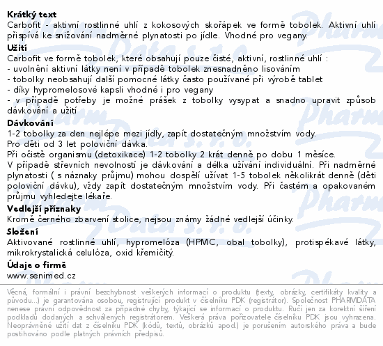 Doplněk stravy Carbofit - aktivní rostlinné uhlí v rostlinných tobolkách. Přispívá k snižování nadměrné plynatosti po jídle.