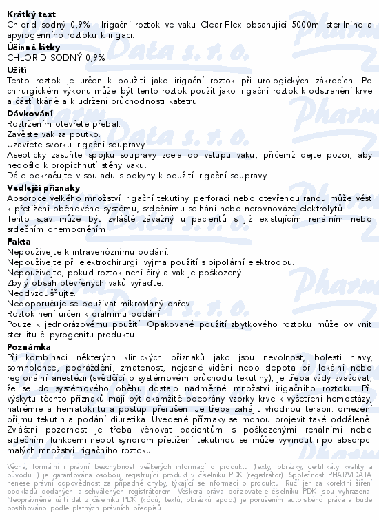 Chlorid sodný 0, 9% - Irigační roztok ve vaku Clear-Flex obsahující 5000ml sterilního a apyrogenního roztoku k irigaci.
