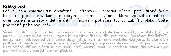 Léčivá látka chlorhexidin obsažená v přípravku Corsodyl působí proti široké škále bakterií, proti kvasinkám, některým plísním a virům, které způsobují infekční onemocnění a záněty v dutině ústní. Přispívá k potlačení tvorby zubního plaku. Čtěte pozorně příbalový leták.