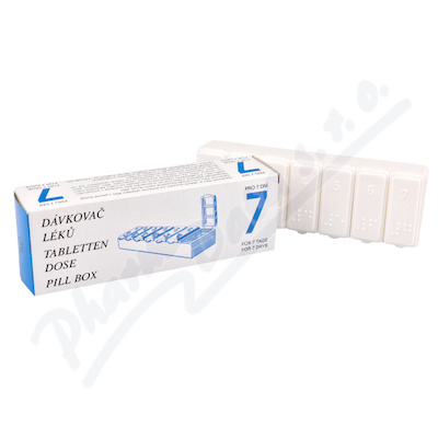Dávkovač léků pro 7 dní je dělené pouzdro, které slouží k dočasnému ukládání léků v pevné formě. Je označen symboly zobrazujícími jednotlivé dny v týdnu. Dny v týdnu jsou rozděleny tak, že umožňují uložení léků na ráno-poledne-večer. Barva bílá.