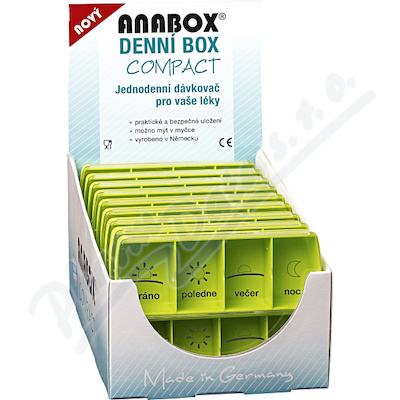 Moderní design, velká kapacita na léky, snadná manipulace, veselé barvy - to je nový ANABOX DENNÍ BOX COMPACT. Vyrobeno a patentováno v Německu. Možno mýt v myčce na nádobí. Vysoce odolný proti rozbití. Praktické a bezpečné uložení léků.