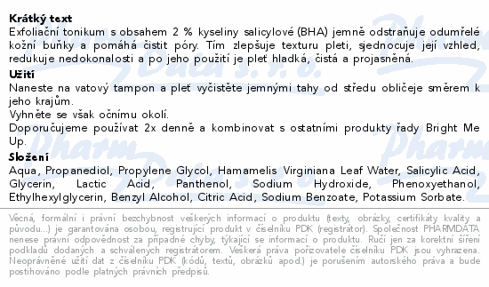Exfoliační tonikum s obsahem 2 % kyseliny salicylové (BHA) jemně odstraňuje odumřelé kožní buňky a pomáhá čistit póry. Tím zlepšuje texturu pleti, sjednocuje její vzhled, redukuje nedokonalosti a po jeho použití je pleť hladká, čistá a projasněná.