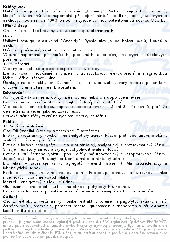 Unikátní emulgel na bázi ozónu s aktivními "Ozonidy". Rychle ulevuje od bolesti svalů, kloubů a šlach. Výrazně napomáhá při hojení zánětů, podlitin, otoku, svalových a šlachových poraněních. 100% přírodní s vysoce účinnou patentovanou složkou OZOILE.