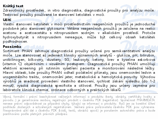 Zdravotnický prostředek, in vitro diagnostika, diagnostické proužky pro analýzu moče. Testovací proužky používané ke stanovení ketolátek v moči.