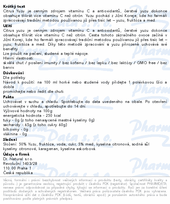 Citrus Yuzu je cenným zdrojem vitamínu C a antioxidantů, čerstvé yuzu dokonce obsahuje třikrát více vitamínu C než citrón. Yuzu pochází z Jižní Koreje, kde ho farmáři zpracovávají tradiční metodou používanou již přes tisíc let – yuzu, fruktóza a med.