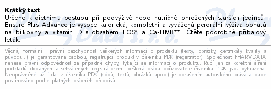 Určeno k dietnímu postupu při podvýživě nebo nutričně ohrožených starších jedinců. Ensure Plus Advance je vysoce kalorická, kompletní a vyvážená perorální výživa bohatá na bílkoviny a vitamín D s obsahem FOS* a Ca-HMB**. Čtěte pozorně příbalový leták.