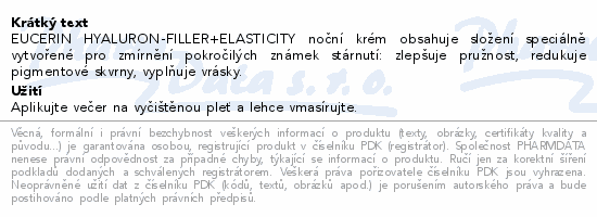 EUCERIN HYALURON-FILLER+ELASTICITY noční krém obsahuje složení speciálně vytvořené pro zmírnění pokročilých známek stárnutí: zlepšuje pružnost, redukuje pigmentové skvrny, vyplňuje vrásky.