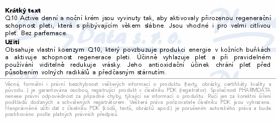 Q10 Active denní a noční krém jsou vyvinuty tak, aby aktivovaly přirozenou regenerační schopnost pleti, která s přibývajícím věkem slábne. Jsou vhodné i pro velmi citlivou pleť. Bez parfemace.