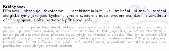 Přípravek obsahuje fexofendin - antihistaminikum ke zmírnění příznaků sezónní alergické rýmy jako jsou kýchání, rýma a svědění v nose, svědění očí, slzení a zarudnutí očních spojivek. Čtěte pozorně příbalový leták.