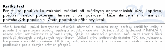 Fenistil se používá ke zmírnění svědění při svědivých onemocněních kůže, kopřivce, poštípání nebo pokousání hmyzem, při poškození kůže sluncem a u mírných povrchových popálenin. Čtěte pozorně příbalový leták.