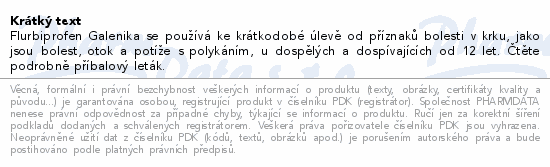 Flurbiprofen Galenika se používá ke krátkodobé úlevě od příznaků bolesti v krku, jako jsou bolest, otok a potíže s polykáním, u dospělých a dospívajících od 12 let. Čtěte pozorně příbalový leták.