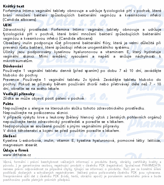Forfemina Intimo vaginální tablety obnovuje a udržuje fyziologické pH v pochvě, které brání množení bakterií způsobujících bakteriální vaginózu a kvasinkovou infekci (Candida albicans).