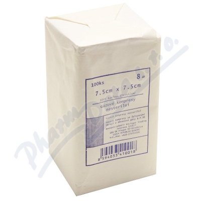 Kompresy z gázy, sterilní slouží k čistění, vysoušení a ošetření ran, popř. zastavení krvácení. Jsou vyrobeny z měkké, vysoce savé gázy ze 100% bavlny. Jsou prodyšné a jemné. mají hustotu 17nití na cm2. Kompresy jsou 8 vrstvé se založenými okraji.