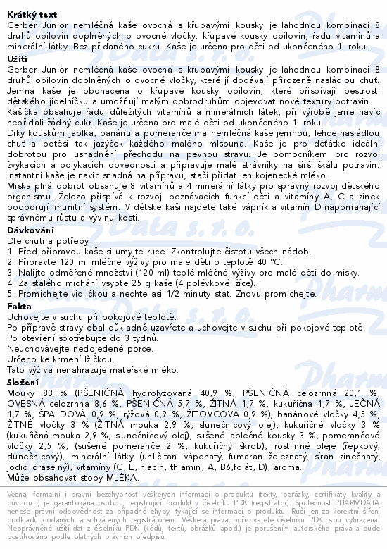 Gerber Junior nemléčná kaše ovocná s křupavými kousky je lahodnou kombinací 8 druhů obilovin doplněných o ovocné vločky, křupavé kousky obilovin, řadu vitamínů a minerální látky. Bez přidaného cukru. Kaše je určena pro děti od ukončeného 1. roku.