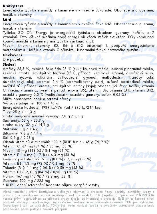 GO ON Energetická tyčinka oříšek karamel obsahuje vitamin B, vitamin C, vitamin E, guaranu a hořčík. Je vhodná pro všechny osoby s...