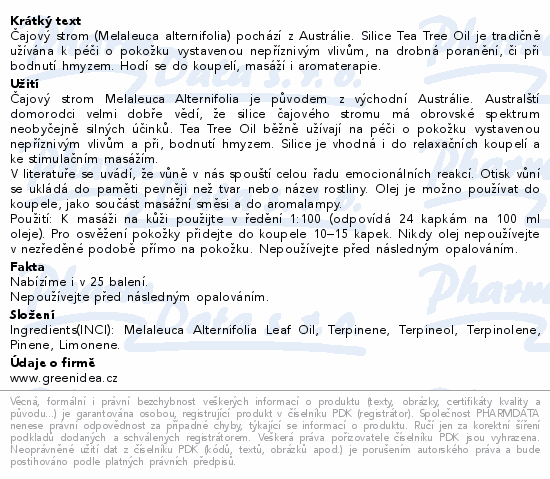 Čajový strom (Melaleuca alternifolia) pochází z Austrálie. Silice Tea Tree Oil je tradičně užívána k péči o pokožku vystavenou nepříznivým vlivům, na drobná poranění, či při bodnutí hmyzem. Hodí se do koupelí, masáží i aromaterapie.