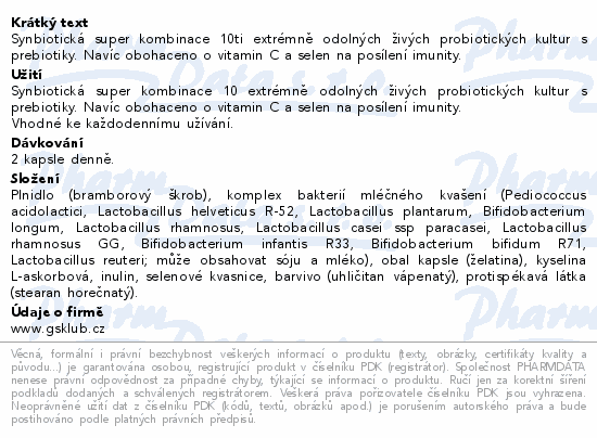 Synbiotická super kombinace 10 extrémně odolných živých probiotických kultur s prebiotiky. Navíc obohaceno o vitamin C a selen na...