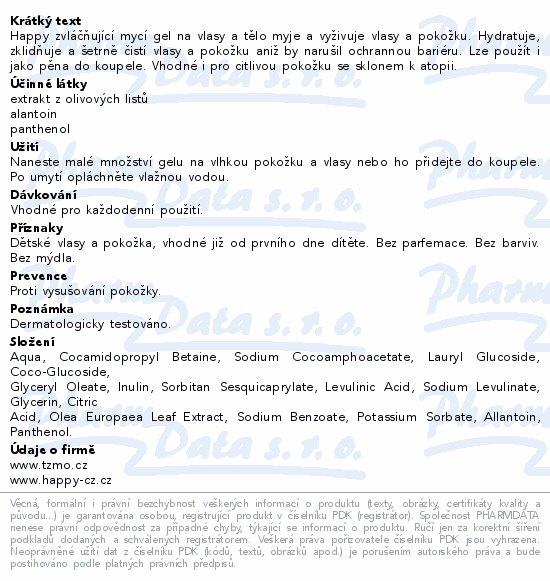 Happy zvláčňující mycí gel na vlasy a tělo myje a vyživuje vlasy a pokožku. Hydratuje, zklidňuje a šetrně čistí vlasy a pokožku aniž by narušil ochrannou bariéru. Lze použít i jako pěna do koupele. Vhodné i pro citlivou pokožku se sklonem k atopii.