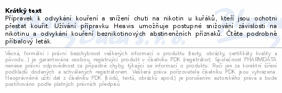 Přípravek k odvykání kouření a snížení chuti na nikotin u kuřáků, kteří jsou ochotni přestat kouřit. Užívání přípravku Heavis umožňuje postupné snižování závislosti na nikotinu a odvykání kouření beznikotinových abstinenčních příznaků. Čtěte pozorně příbalový leták.