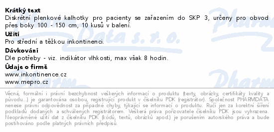 Diskrétní plenkové kalhotky pro pacienty se zařazením do SKP 3, určeny pro obvod přes boky 100 - 150 cm, 10 kusů v balení.