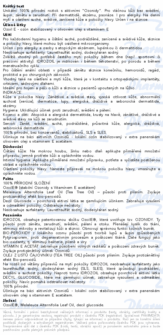 Unikátní 100% přírodní roztok s aktivními "Ozonidy". Pro vláčnou kůži bez svědění, šupin, zánětu a zarudnutí. Při dermatitidě, ekzému, psoriáze. I pro alergiky. Na denní mytí a ošetření suché, svědivé, zanícené kůže a pokožky hlavy. Určen i na sliznice.