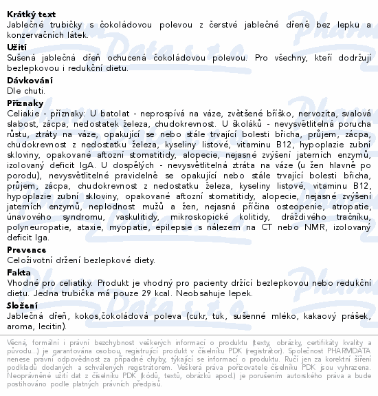 Jablečné trubičky s čokoládovou polevou z čerstvé jablečné dřeně bez lepku a konzervačních látek.