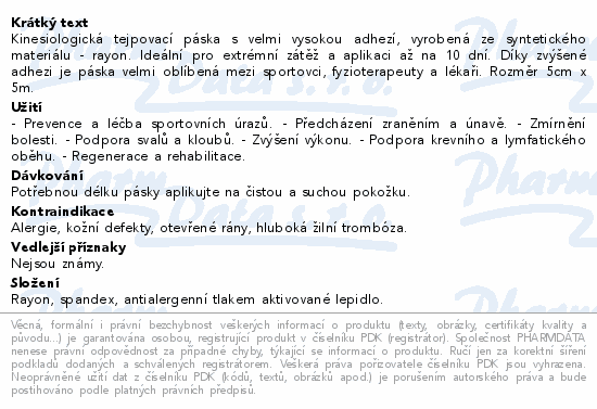 Kinesiologická tejpovací páska s velmi vysokou adhezí, vyrobená ze syntetického materiálu - rayon. Ideální pro extrémní zátěž a aplikaci až na 10 dní. Díky zvýšené adhezi je páska velmi oblíbená mezi sportovci, fyzioterapeuty a lékaři. Rozměr 5cm x 5m.