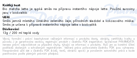 Bio matcha latte je sypká směs na přípravu instantího nápoje latte. Použité suroviny jsou v biokvalitě.