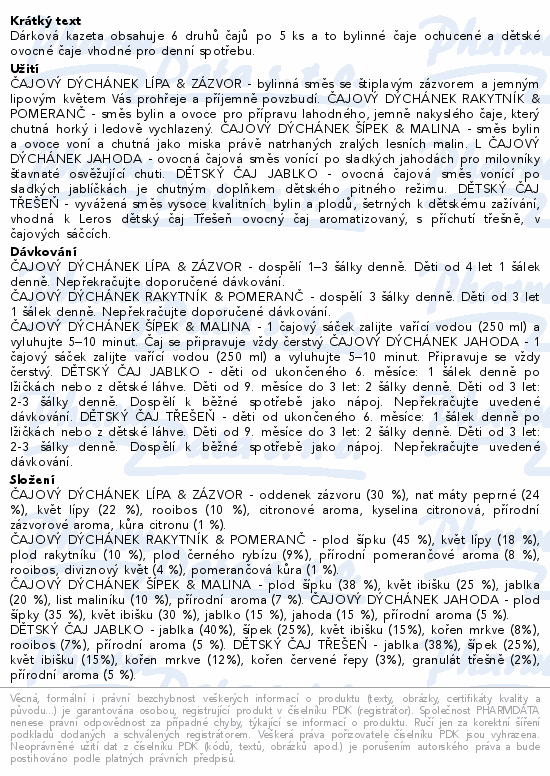 Balení obsahuje 3 druhy čajů: LEROS ČAJOVÝ DÝCHÁNEK ČERNÝ RYBÍZ, LEROS ČAJOVÝ DÝCHÁNEK LESNÍ PLODY, LEROS BYLINKOVÁ ENERGIE.