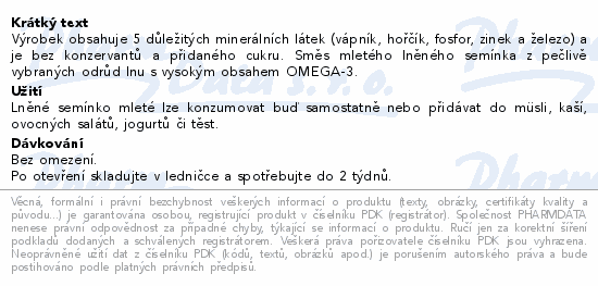 Výrobek obsahuje 5 důležitých minerálních látek (vápník, hořčík, fosfor, zinek a železo) a je bez konzervantů a přidaného cukru. Směs mletého lněného semínka z pečlivě vybraných odrůd lnu s vysokým obsahem OMEGA-3.