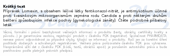 Přípravek Lomexin, s obsahem léčivé látky fentikonazol-nitrát, je antimykotikum účinné proti kvasinkovým mikroorganismům zejména rodu Candida a proti některým druhům bakterií způsobujícím infekce pochvy (gynekologické záněty). Čtěte pozorně příbalový leták.