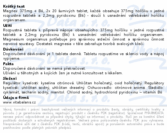 Magnex 375mg + B6, 2x 20 šumivých tablet, každá obsahuje 375mg hořčíku v jedné rozpustné tabletě a 2, 2mg pyridoxinu (B6) - slouží k usnadnění vstřebávání hořčíku organismem.