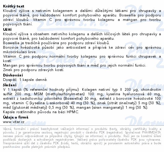 Kloubní výživa s nativním kolagenem a dalšími důležitými látkami pro chrupavky a pojivové tkáně, pro každodenní komfort pohybového aparátu. Boswellia pro podporu zdraví kloubů. Vitamin C pro správnou tvorbu kolagenu a mangan pro tvorbu pojivových tkání.