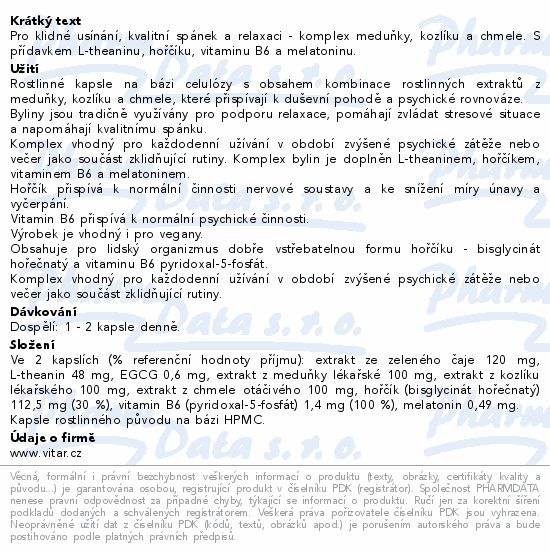 Pro klidné usínání, kvalitní spánek a relaxaci - komplex meduňky, kozlíku a chmele. S přídavkem L-theaninu, hořčíku, vitaminu B6 a melatoninu.